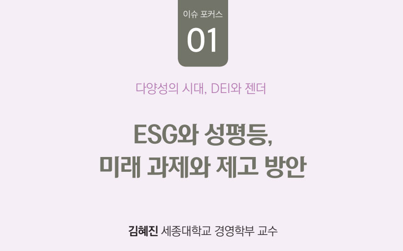 이번 코너는 다양성의 시대, DEI를 성인지적 관점이 투영된 시각으로 접근해 보았으며 ESG와 성평등에 대해 논의해 보고 미래지향적인 개선 방안을 모색하였습니다. 또한 국내외에서 다양성을 실천하고 있는 우수사례를 짚어보고 마지막으로 DEI를 통해 포용적·실효적인 새로운 조직문화 조성을 위한 여성 리더십의 교육 방향을 깊이 있게 제시해 보고자 했습니다.