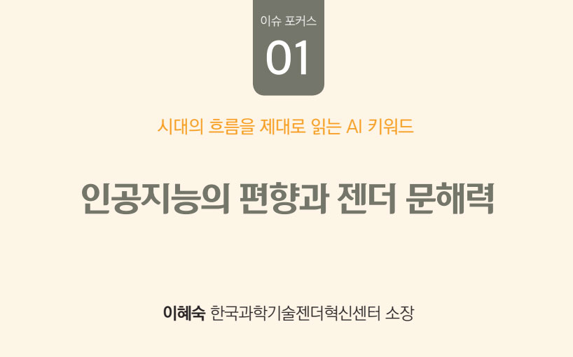 디지털 시대, AI 기술이 빠른 속도로 재편되는 일상의 경험 속에서 제대로 된 대처를 하기 위해 지금 이 순간을 어떻게 채워야 하는지 고민하게 된다. 변화를 경험하면서 우리는 늘 더 좋은 사회와 더 나은 삶의 대안을 과제로 풀어 왔다. 디지털 세상으로의 변화가 가속화되는 현재, 성별 형평성에 대한 노력은 지속가능한 사회의 성장 동력을 담보하는 중요한 열쇠다.