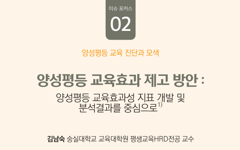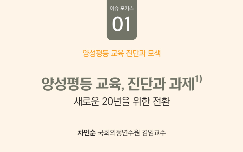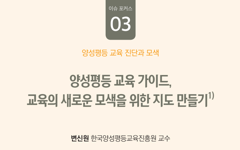 이 3편의 논문은 2023년 4월 26일 있었던 한국양성평등 교육 진흥원의 20주년 특별세미나 <양성평등, 관점 전환이 만드는 변화의 힘>의 발표 내용을 기초로 토론과 질의에서 나온 의견들을 반영하여 수정・보완된 원고이다.