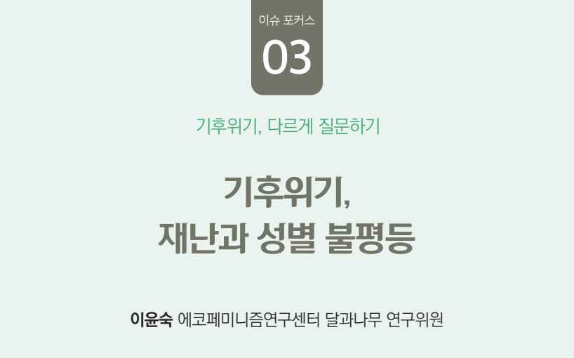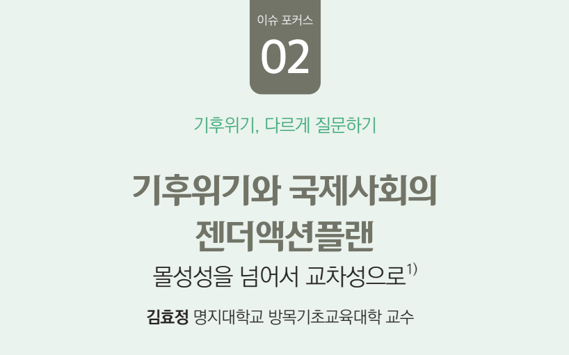 기후위기는 성별과 계층, 세대 등에 따라 불균등한 영향을 미치는 복합적 사회 재난으로서, 이러한 재난 상황에서는 생명, 신체, 경제적 위협에 더욱 쉽게 노출되는 여성과 취약계층이 더 큰 피해를 입고, 이는 기존의 차별적 구조를 더욱 고착시킬 수 있습니다. 국제사회는 기후변화 대응에 성평등 관점을 통합하기 위해 젠더액션플랜(GAP)을 수립하는 등 다각적 노력을 기울이고 있으나, 실질적인 평등 실현을 위해서는 교차성 관점의 접근이 이루어져야 합니다. 한국 역시 성인지적 관점을 반영한 기후 정책 구축과 젠더 관점을 도입한 전환적 접근이 시급합니다.