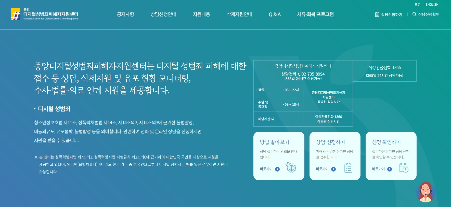 성평등가족부 산하 공공기관 한국여성인권진흥원이 운영하는 중앙디지털성범죄피해자지원센터에서는 전국 어디서나 365일 24시간 동안 모든 여성폭력 관련 피해를 상담하고 있습니다.